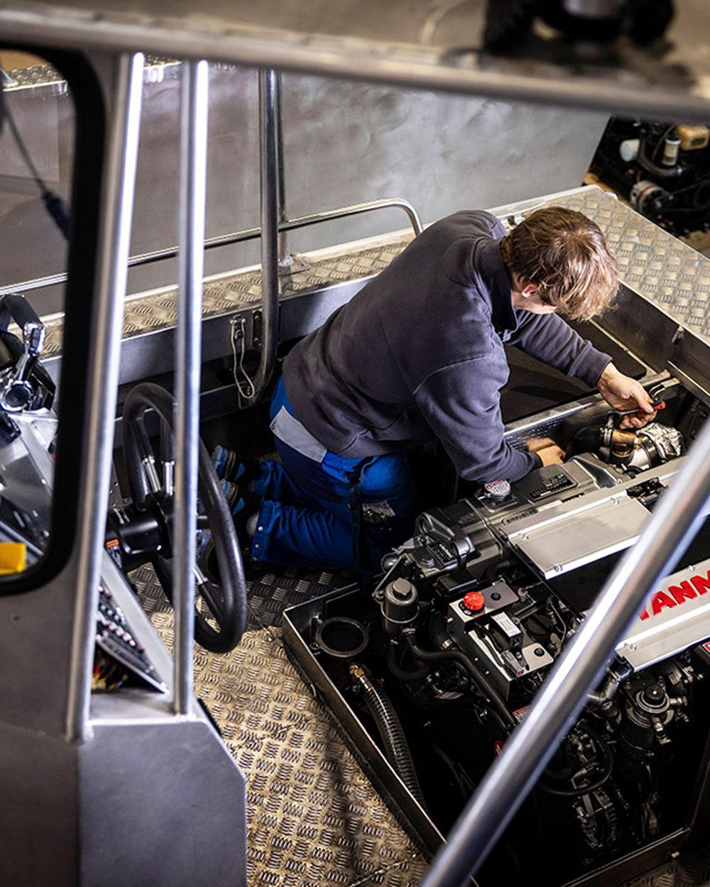 Innenliegende Benzin- oder Dieselmotoren in Kombination mit einer schwenkbaren Antriebseinheit sorgen für eine effiziente Kraftübertragung und hohe Manövrierfähigkeit.